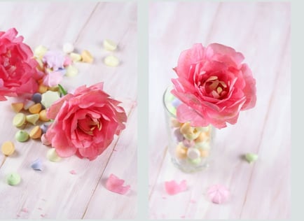 Herstellen einer Rose, Ranunkel, Anemone, Pompons, Konfetti und Rosenblätter.